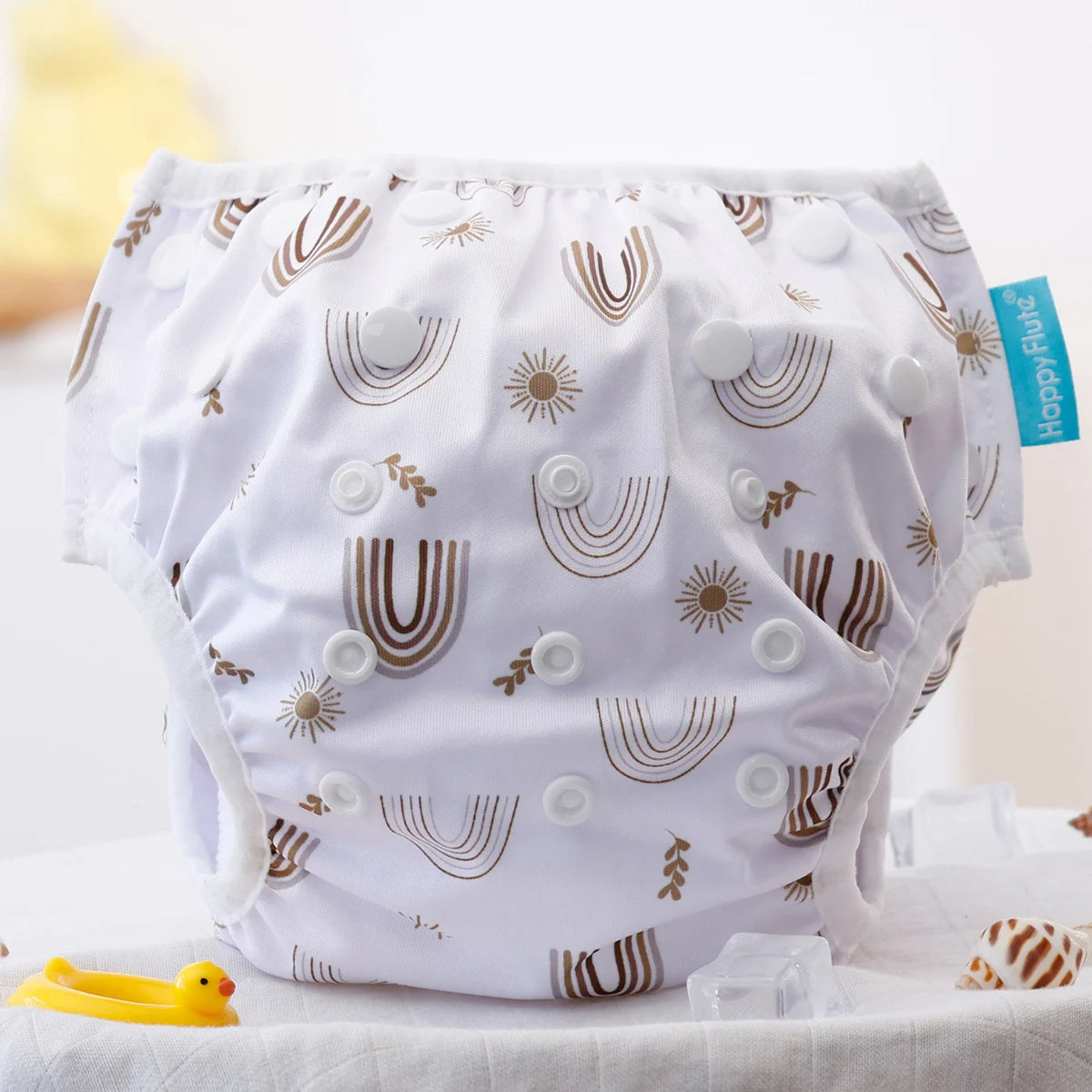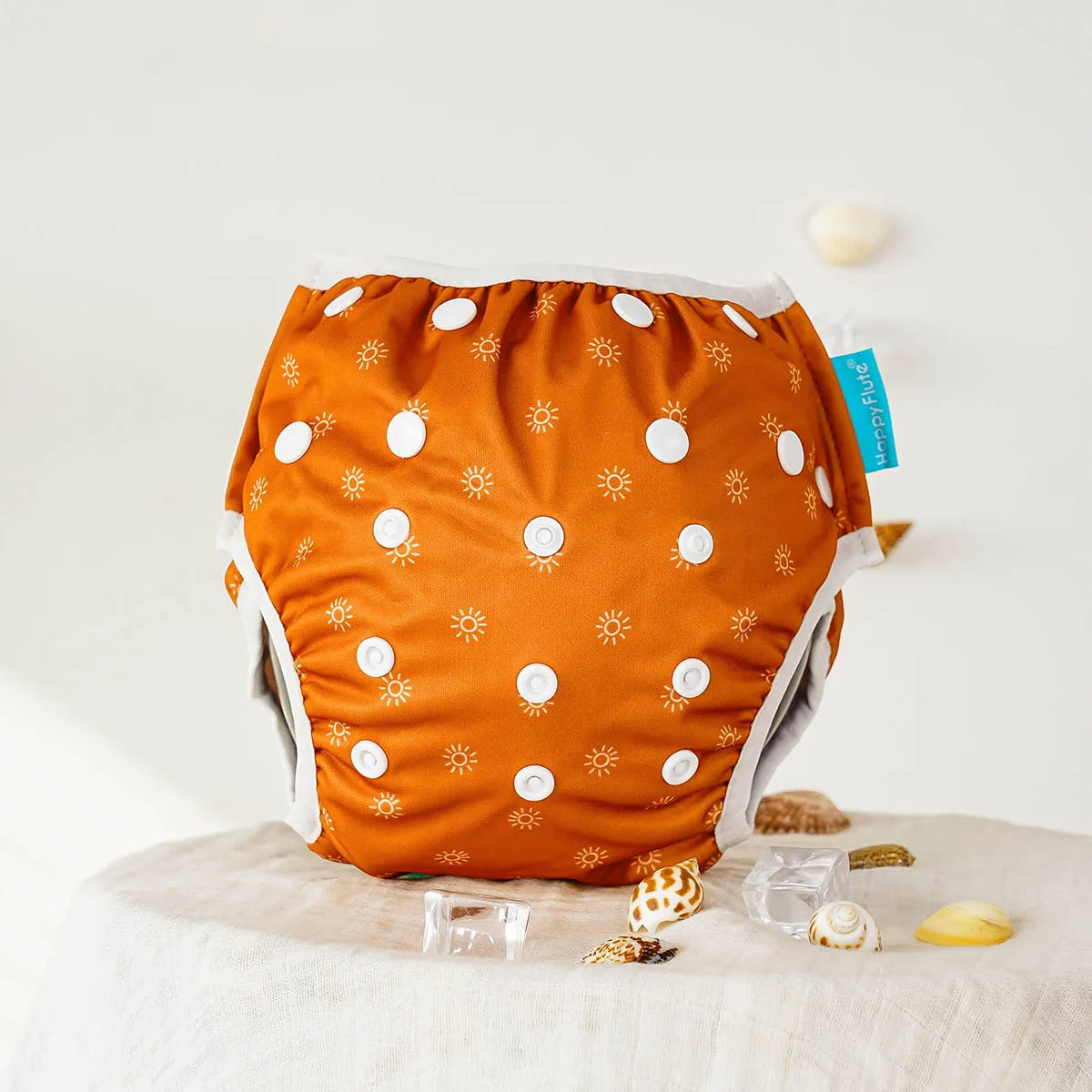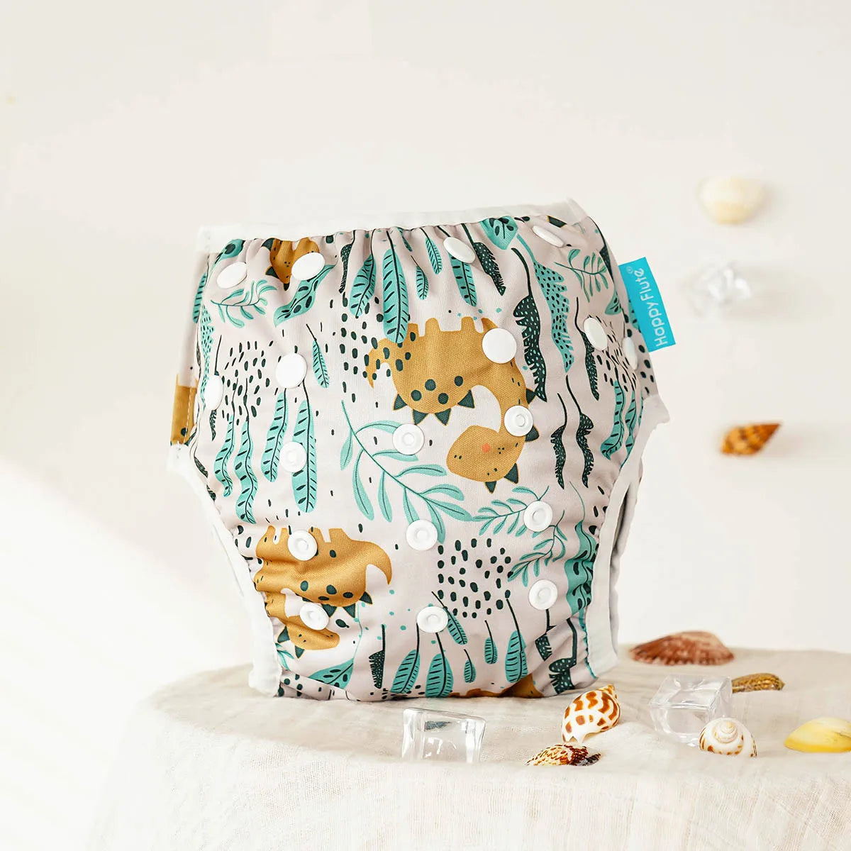 A waterproof PUL outer layer is designed to hold solids (without absorbing water), helping prevent pool accidents while keeping the diaper trim and lightweight.