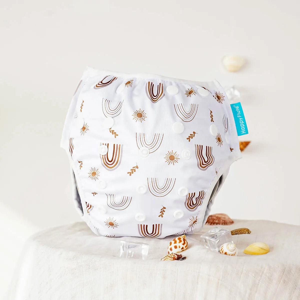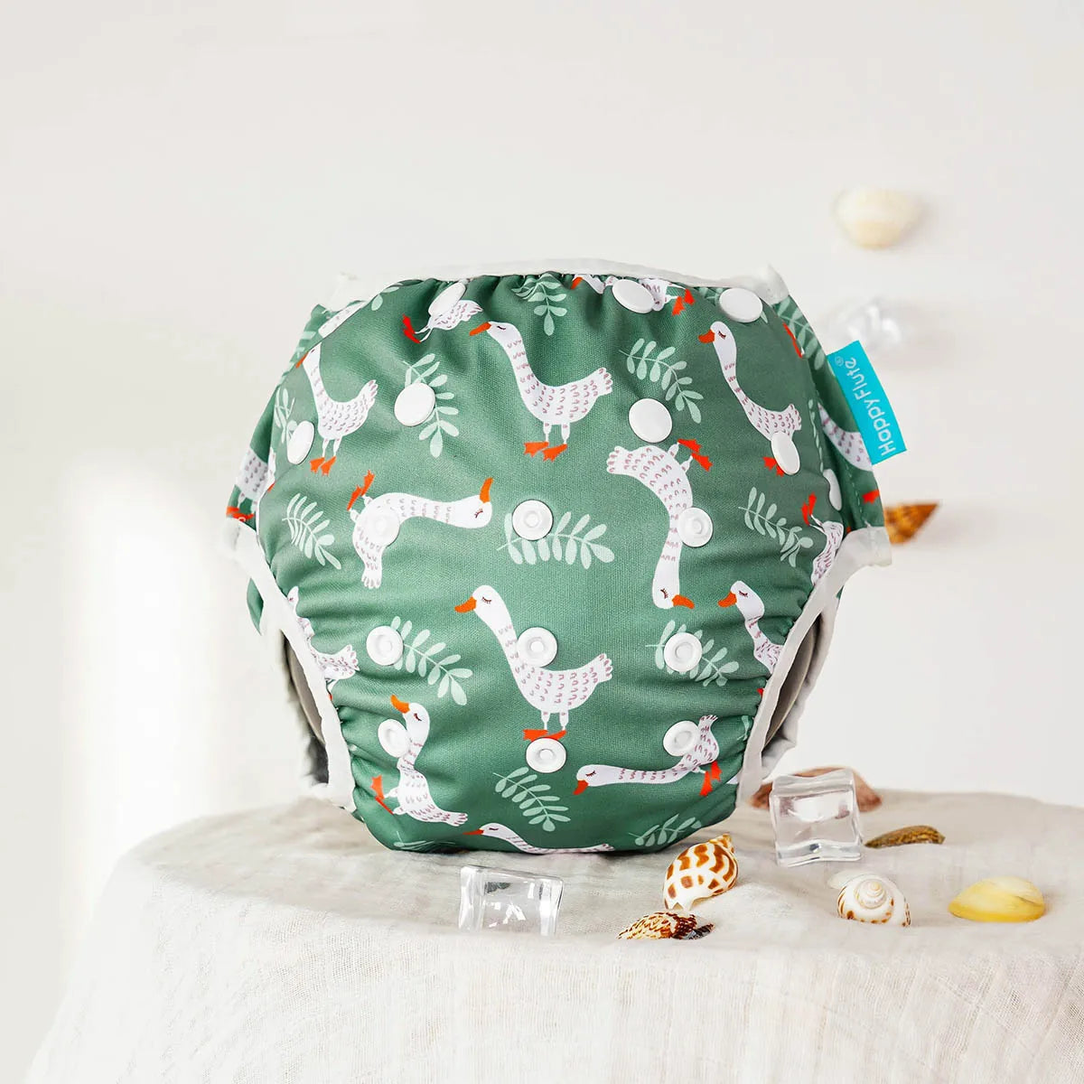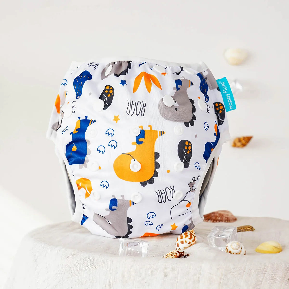 A waterproof PUL outer layer is designed to hold solids (without absorbing water), helping prevent pool accidents while keeping the diaper trim and lightweight.