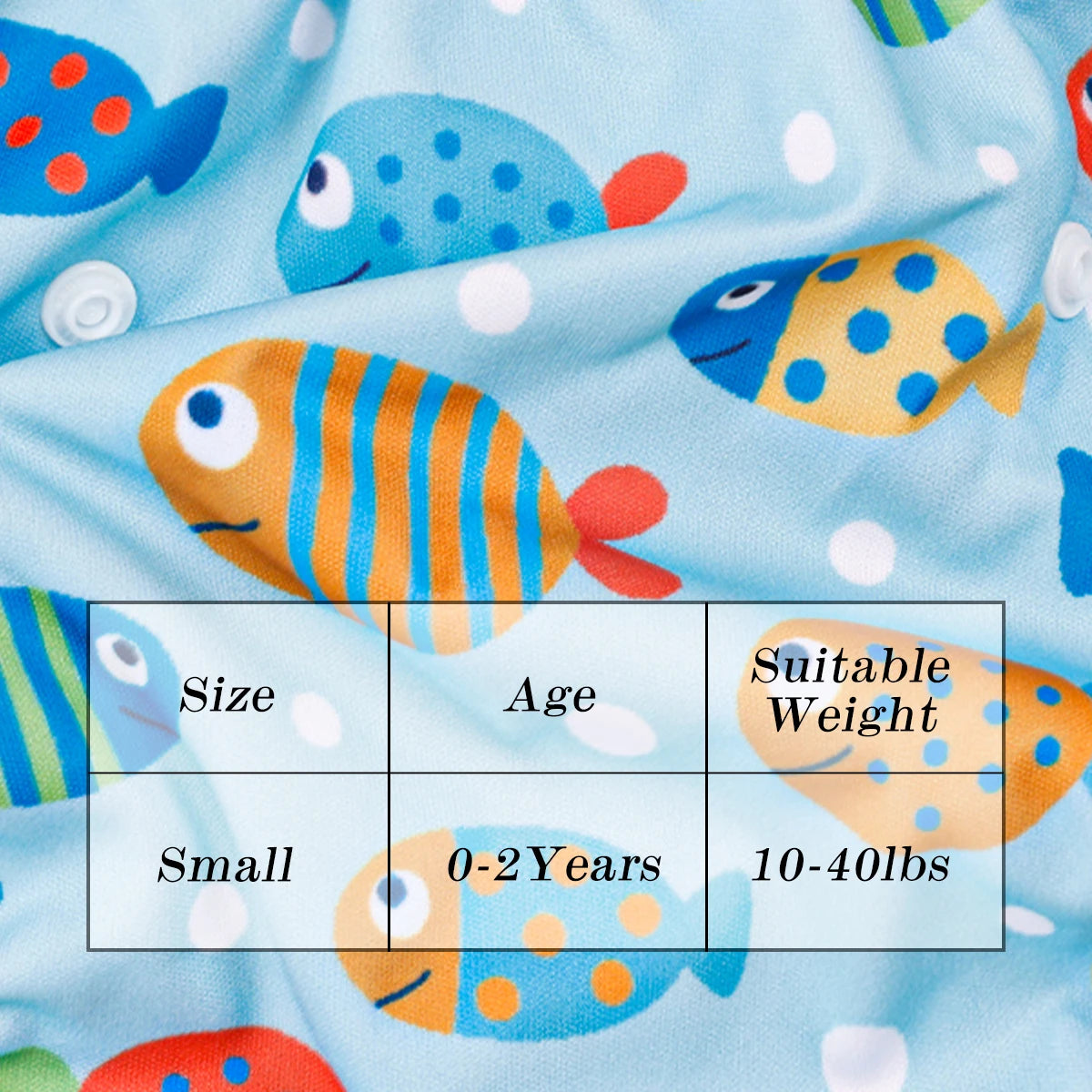 Smart snap systems (double-side waist snaps and front rise snaps) adjust to S, M, L sizes—growing with your baby from 10–40 lbs (0–2T). If between sizes, choose the smaller for the best fit.